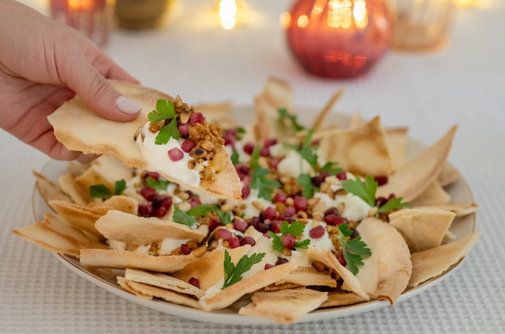 - On a serving platter, spread the lamb mixture in the centre, then spread the yoghurt on top and sprinkle with parsley leaves, toasted pine nuts and pomegranate arils.