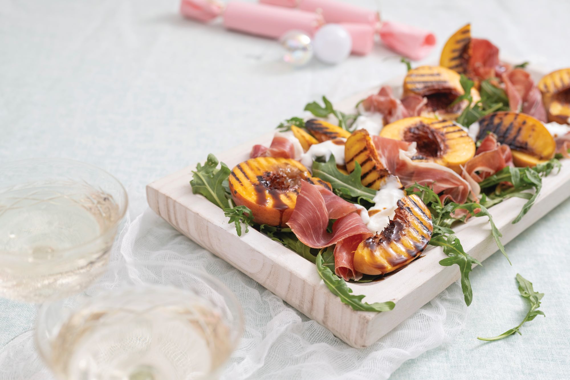 - Place rocket leaves on platter, then add grilled peaches, tuck prosciutto in between and add dollops of goat curd. Season with salt and pepper.