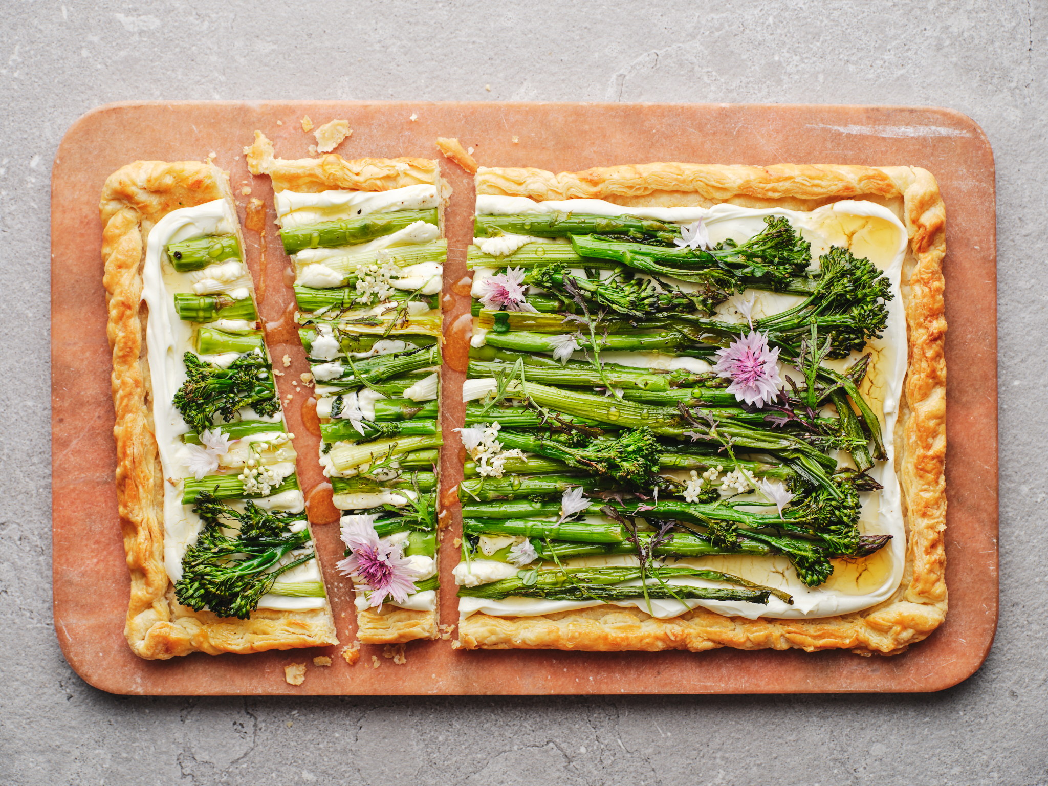 - Arrange the vegetables on top, drizzle with honey and garnish with edible flowers.