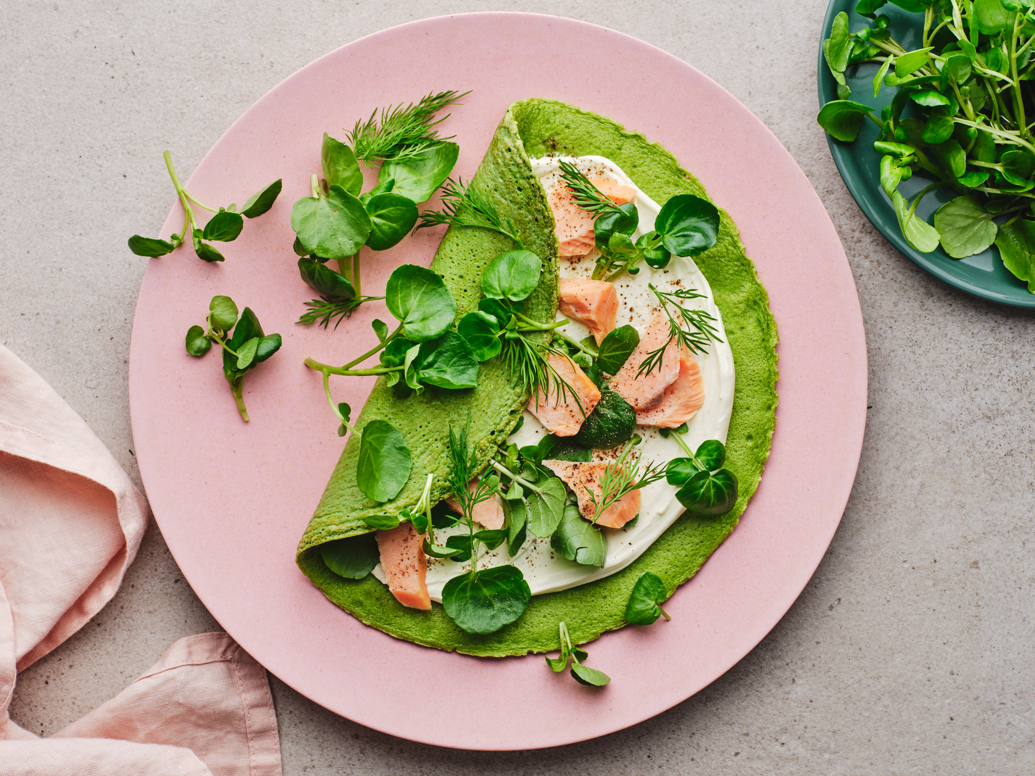 - Slide the omelette onto a plate. Spread with creme fraiche and top with smoked trout, watercress, dill and cracked pepper.