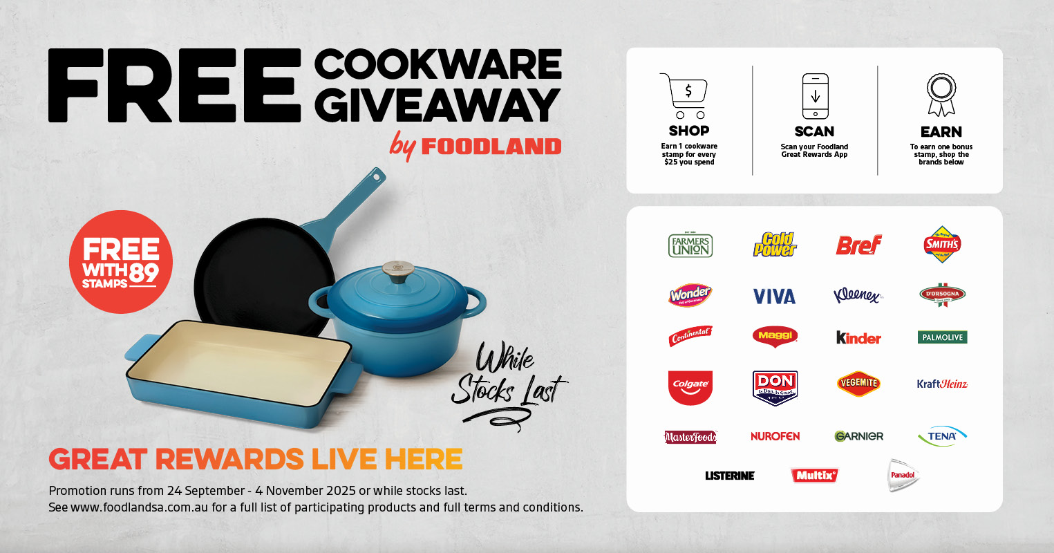 From 24 September to 4 November 2025, Foodland is giving you the chance to collect premium cookware for FREE – but only while stocks last!