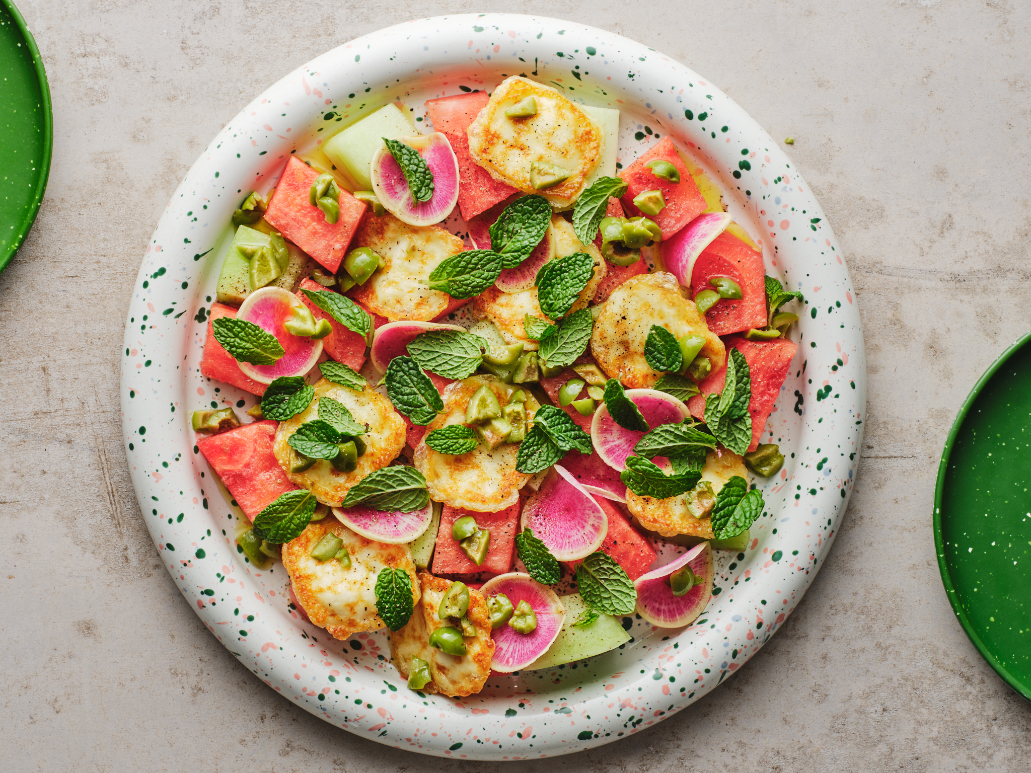 - To assemble, place melons, radish and haloumi onto a serving plate. Season with salt and pepper. Drizzle with dressing and garnish with mint leaves.